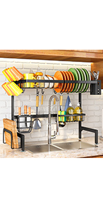 Placed it over the kitchen sink, the dish drying rack with other holders holds goods such as mugs, dishes, bowls, utensils, chopping board, knife, and detergent, etc. Hooks are allowed Hanging cooking ware on the rack. Keep your sink and countertop neat and create tons of extra useful space.