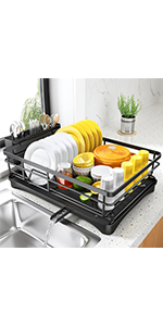 This over sink dish rack is constructed from stainless steel with a sleek black coated finish, providing both durability and rust resistance.