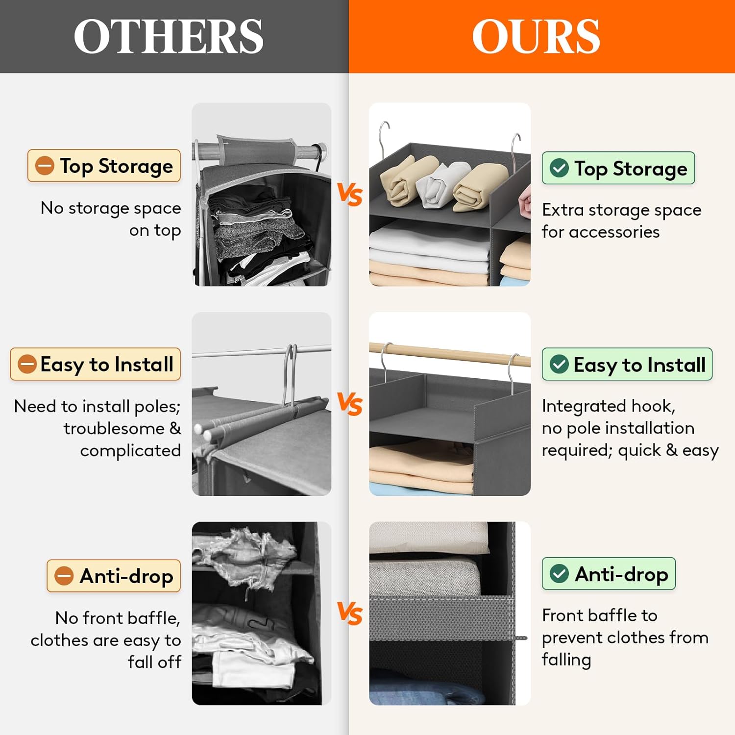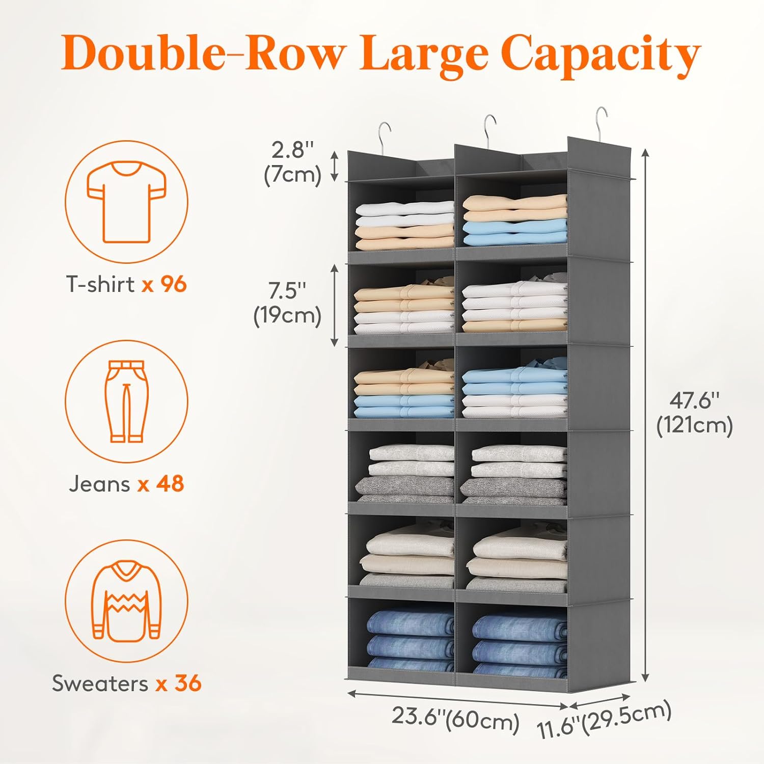 Lifewit Dual-Row 6 Tier Shelf Hanging Closet Organizer and Storage, Clothes Storage Shelves with 3 Sturdy Hooks for Clothing Organization, Foldable Dorm Room Essentials, 12 Sections Grey
