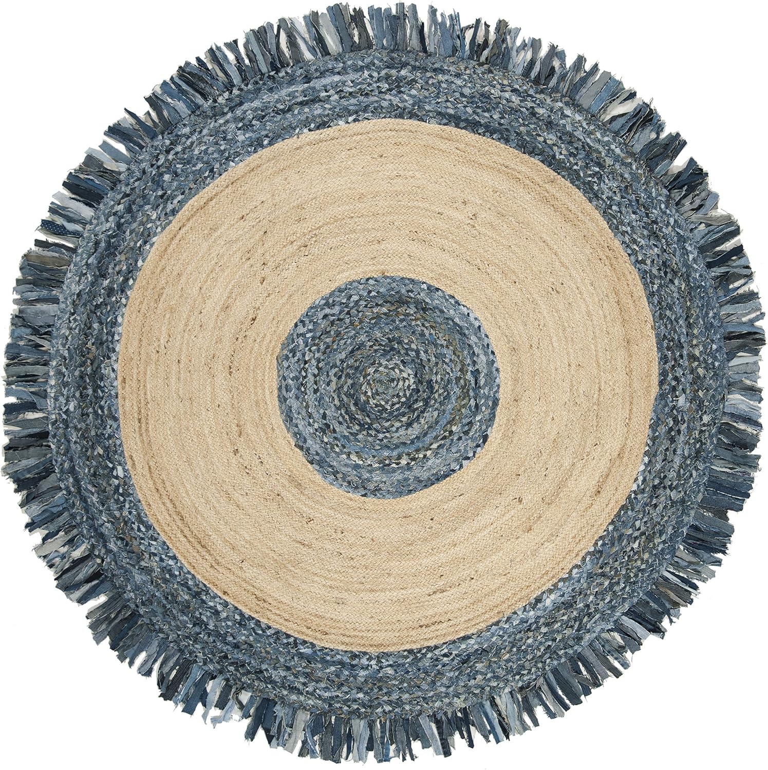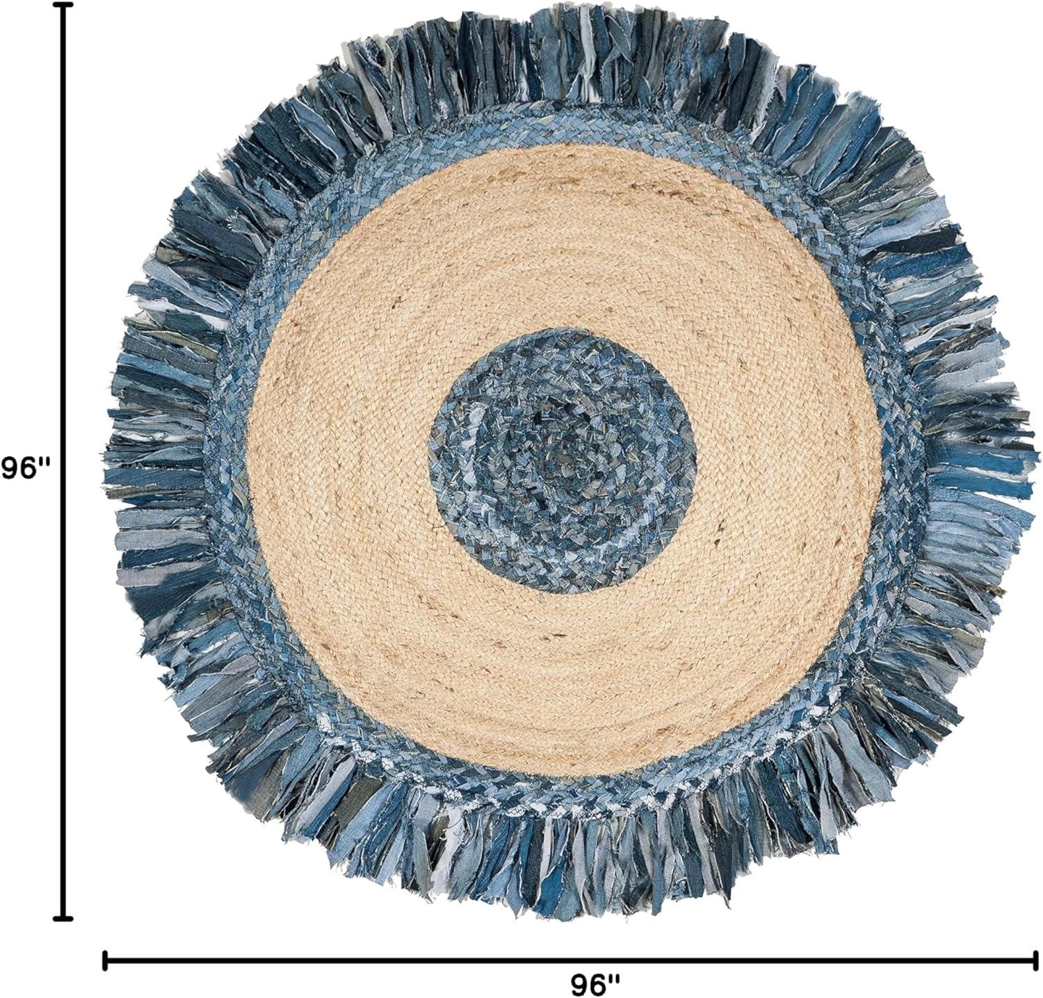 SAFAVIEH Cape Cod Collection Area Rug - 8' Round, Ivory & Denim, Handmade Boho Fringe Jute & Cotton, Ideal for High Traffic Areas in Living Room, Bedroom (CAP205D)